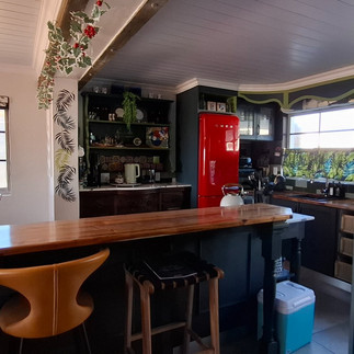 Following the red staircase upstairs, you step onto the distinctive blue-painted floor which creates the sensation of walking across calm ocean water. Here you’ll find the wood-burning stove, forming a cosy indoor lounge area perfect for winter evenings. This space flows into a kitchenette and a sleeping area, making it a fully functional and private upstairs suite. A large sliding door opens from this lounge onto the stoep, where the Kol-Kol wood-fired hot tub rests under the open sky — an ideal spot for slow sunsets, sea breezes and relaxed evenings.